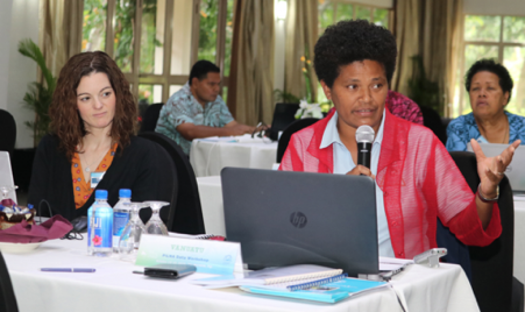 Vanuatu’s Norah Wells contributes to the discussion at the PILNA 2018 workshop. The workshop was one of several initiatives to help Pacific education systems to better leverage the PILNA data. Beside Wells is Louise Ockwell, a research fellow at ACER. Photo by Irene Manarae