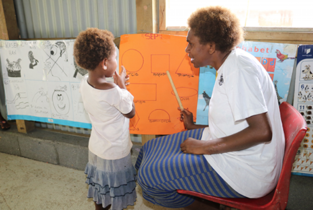 Olivette Nakou of Loukatai Base Kindy in Vanuatu revises basic shapes with one of her students. Enrolment into an early childhood education programme was found by the PILNA 2018 as a positive influence on student performance in literacy and numeracy. Photo by Irene Manarae