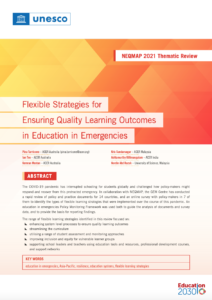 The COVID-19 pandemic has interrupted schooling for students globally and challenged how policy-makers might respond and recover from this protracted emergency. In collaboration with NEQMAP, the GEM Centre has conducted a rapid review of policy and practice documents for 14 countries, and an online survey with policy-makers in 7 of them to identify the types of flexible learning strategies that were implemented over the course of this pandemic. An education in emergencies Policy Monitoring Framework was used both to guide the analysis of documents and survey data, and to provide the basis for reporting findings. The range of flexible learning strategies identified in this review focused on: