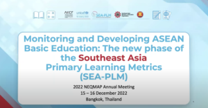 This webinar recording was from the NEQMAP Annual Meeting last 15-16 December 2022 under session 4: Updates and upcoming activities regionally and internationally Presentations on updates and innovations on large-scale assessment and learning monitoring in the region and beyond. The presentation is ‘Monitoring and Developing ASEAN Basic Education: The New Phase of the Southeast Asia Primary Learning Metrics (SEA-PLM)’ by Alejandro Ibanez, Project Manager, SEA-PLM Secretariat.
