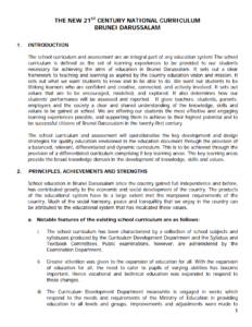 This document provides an outline of the curriculum in Brunei Darussalam and how the curriculum will be broad, balanced, relevant and differentiated, and takes into account each individual’s strengths and weaknesses whilst making provision for progression and 3 continuity. It is intended to be responsive to the changes in the society and the economy and will lead students towards life-long education. SPN21 places the learner at the heart of teaching and learning based on an appreciation of the students’ individual needs. Optimal opportunities will be provided to accelerate individuals who can progress faster whereas special guidance will be given to individuals who need help. The Curriculum Framework and model presented in Figure 10 and Figure 11 act as a platform for developing the curriculum and assessment in the new education system.