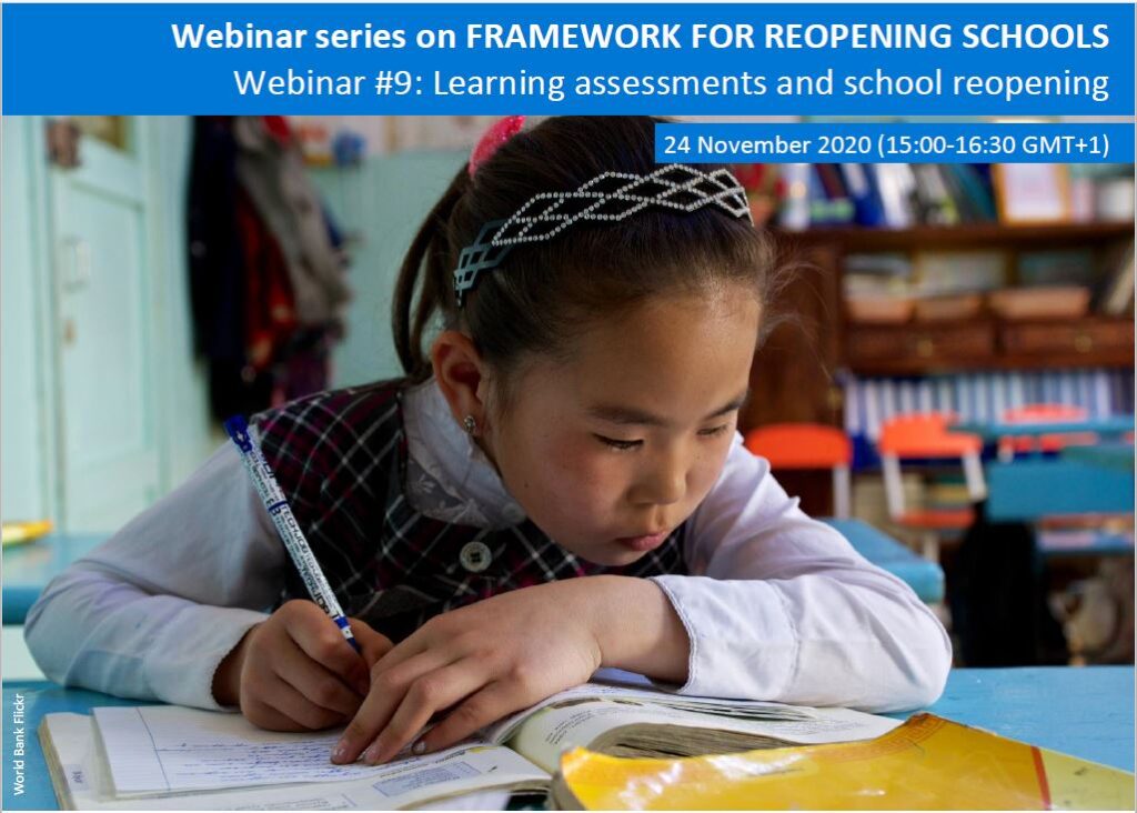 We are pleased to invite you to the ninth webinar of the joint series of webinars on Learning assessments and school reopening taking place on Tuesday, 24 November 2020 from 15:00 to 16:30 (Paris time, GMT+1).